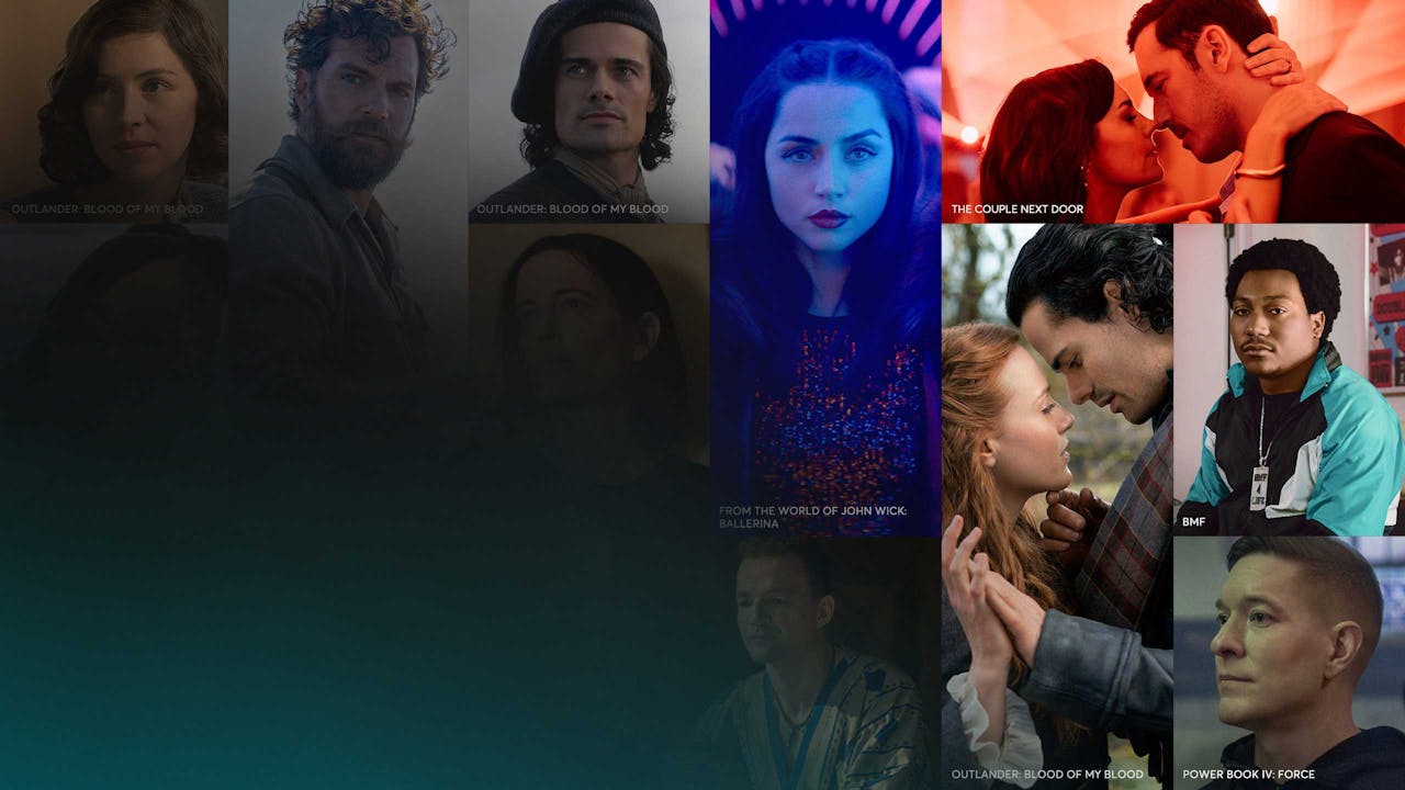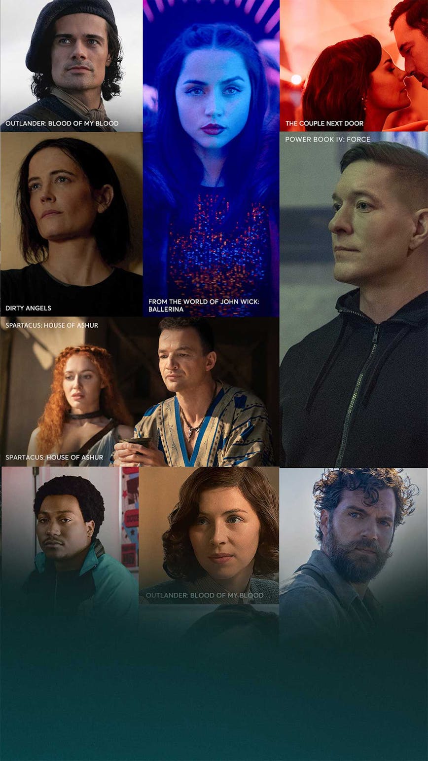 Collage of STARZ content posters including Power Book IV: Force, From the World of John Wick: Ballerina, The Couple Next Door, The Crow, Outlander: Blood of my Blood and The Ministry of Ungentlemanly Warfare